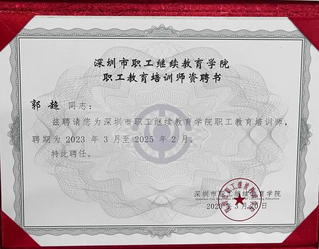 研討會上,全球鷹無人機員工郭超、余國華、侯芬、張濟濱被任聘為深圳市職工繼續教育學院職工教育培訓師。
